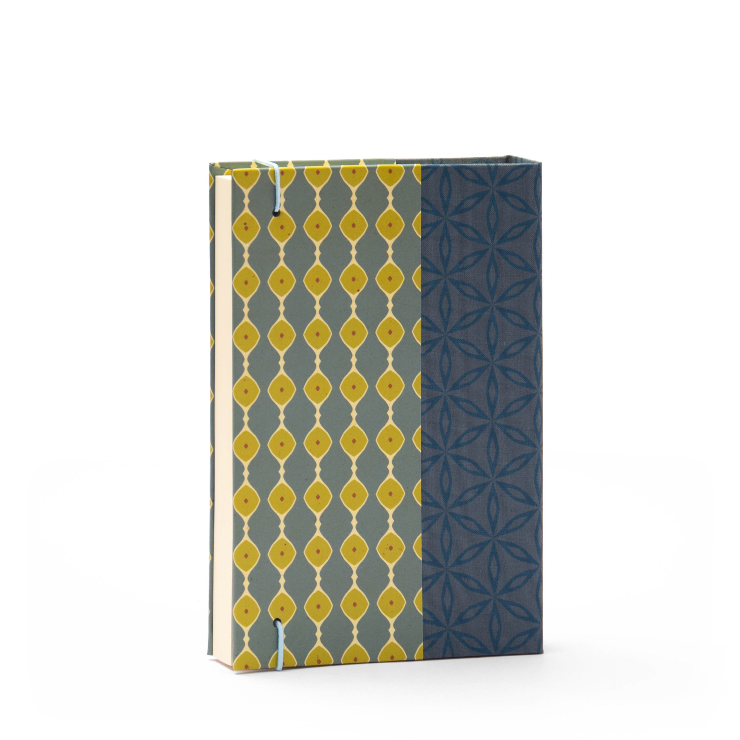 De harde kaft is bekleed met een patroon in diepblauw en oker, afgewerkt met een zeefgedrukte linnen rug die het geheel harmonieus omkadert. Handgebonden en gevuld met soepel crèmekleurig papier dat uitnodigt om te schrijven.