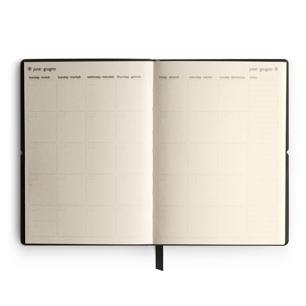De gelijnde variant heeft genummerde bladzijden met vooraan een index, en een datumloze maandplanner en achteraan een lijst voor contactgegevens.