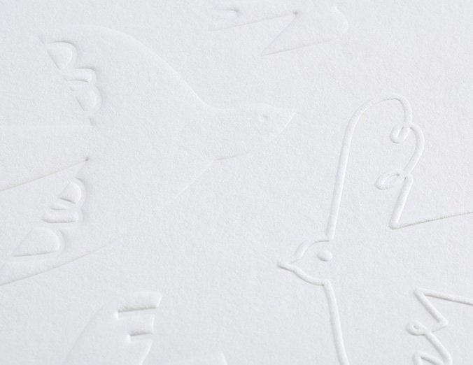De blinddruk toont een zwerm vogels in verschillende vormen en bewegingen. Sommigen eenvoudig, anderen sierlijk — samen suggereren ze vrijheid, vertrouwen en verbondenheid.