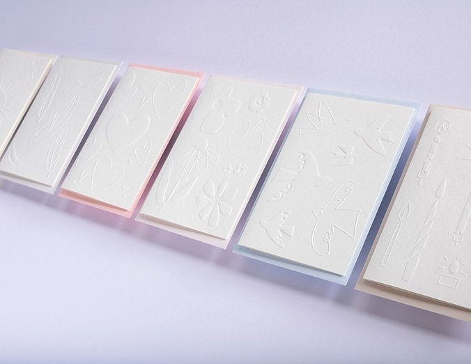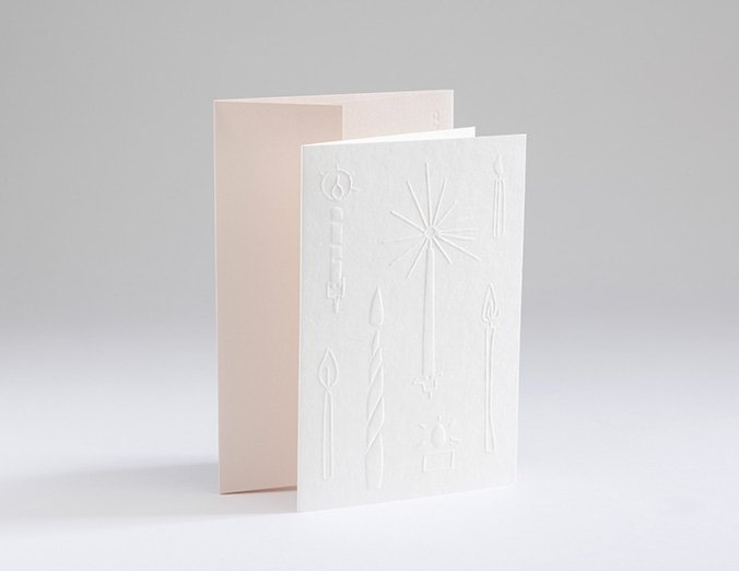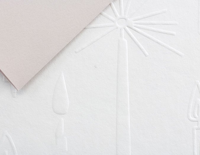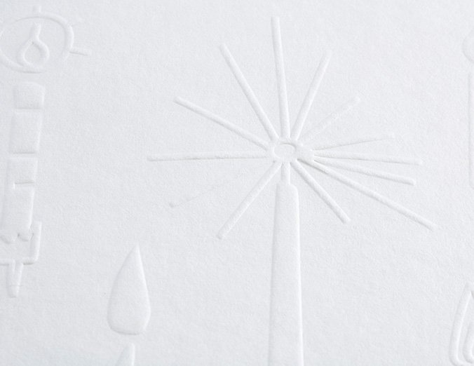 De blinddruk toont een reeks kaarsen — elk uniek van vorm, maar samen verbonden in eenvoud.