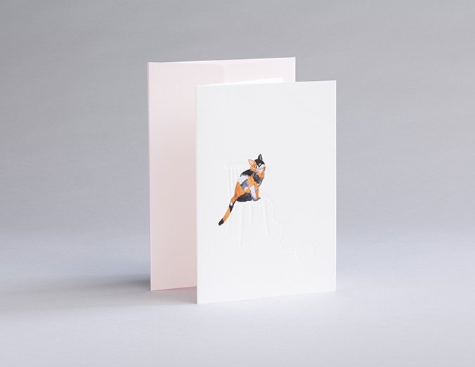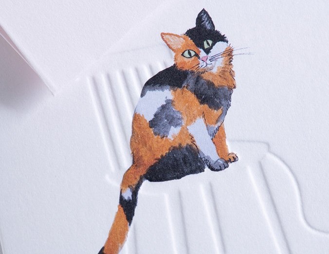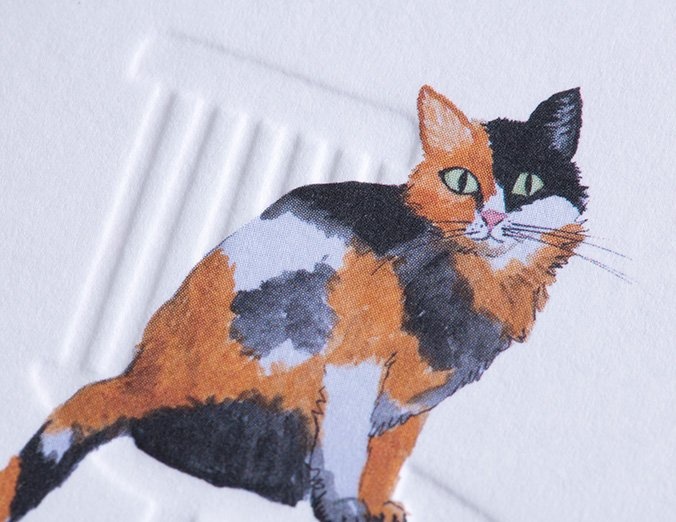 Haar vacht is een mozaïek van roest, zwart en wit. De blinddruk onder haar pootjes suggereert subtiel een omgeving, maar zoals het een kat betaamt, trekt ze zich daar weinig van aan.
