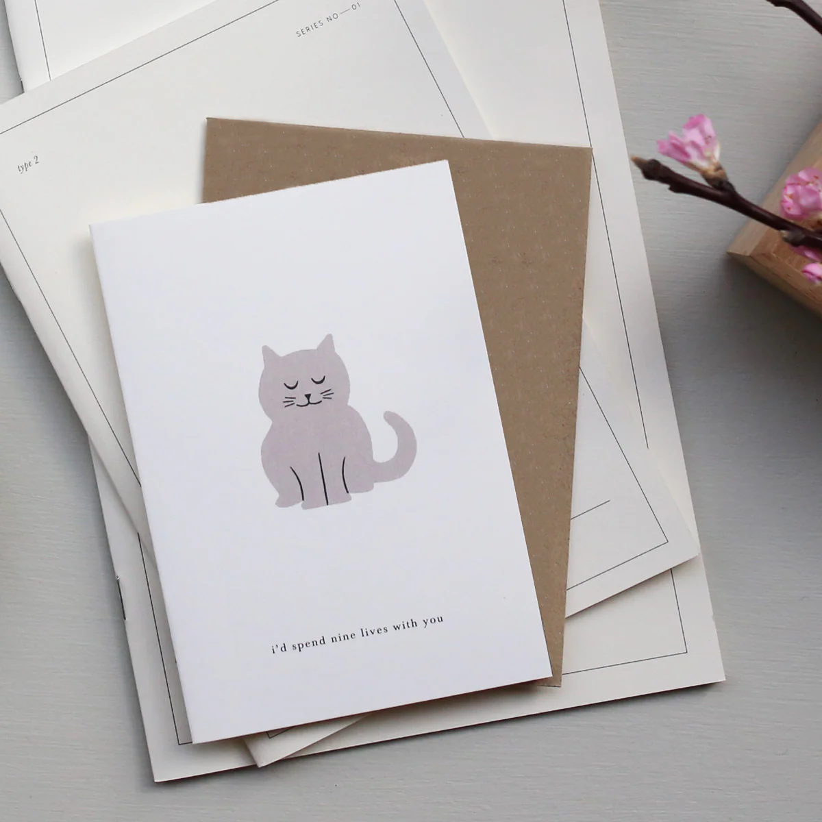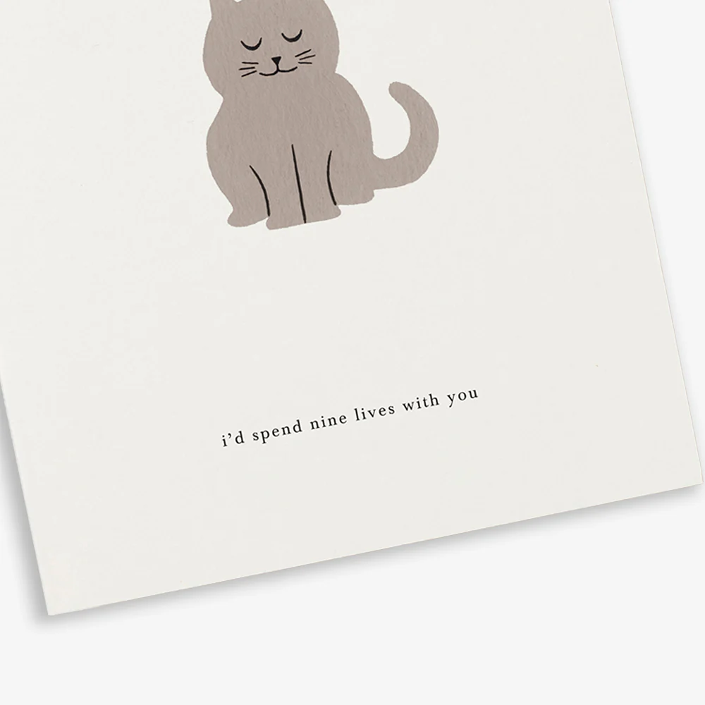 Een eenvoudige maar liefdevolle wenskaart van Kartotek met een zachte illustratie van een kat en de tekst “i’d spend nine lives with you”. Perfect om je waardering of liefde te tonen, of gewoon om iemand een glimlach te bezorgen.