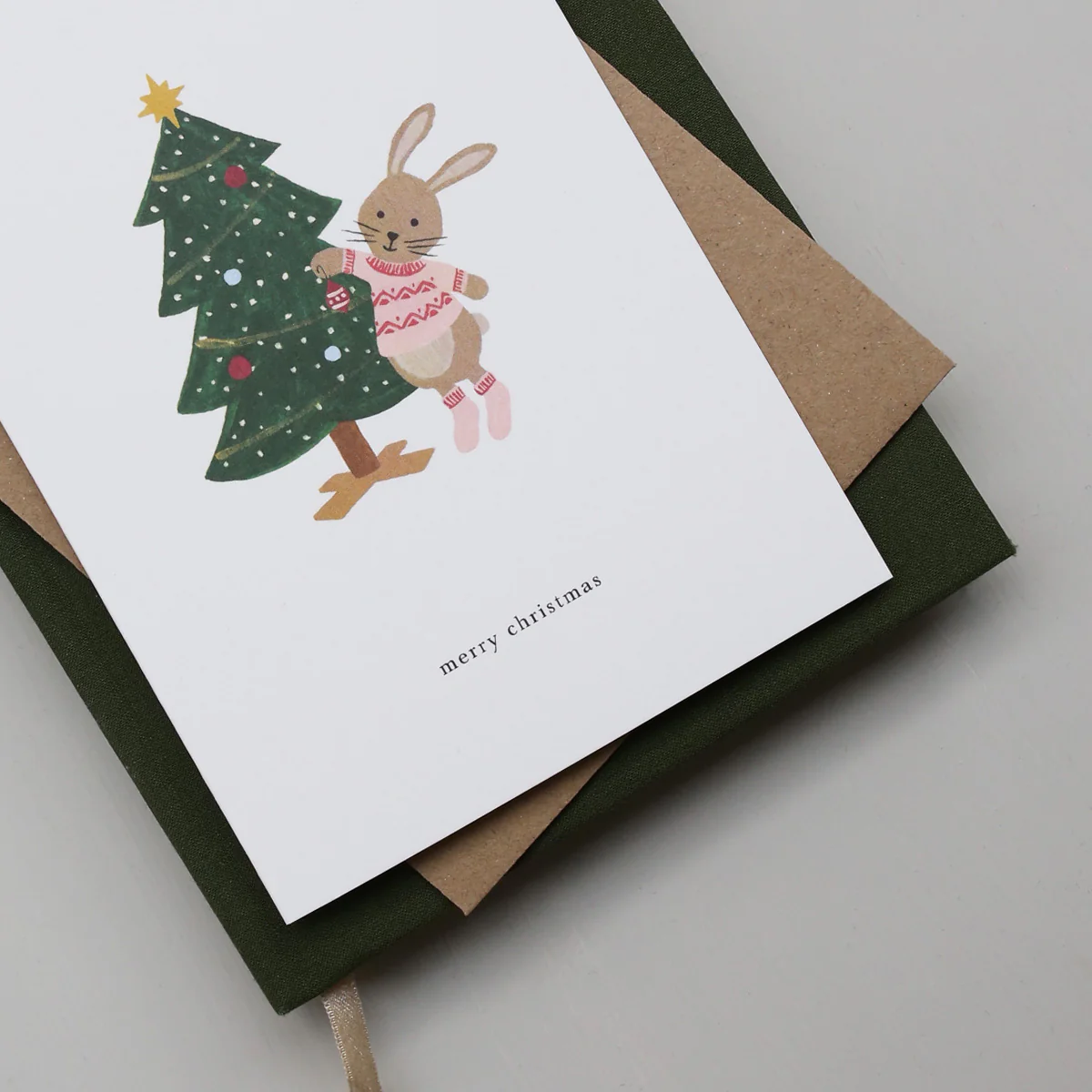 Een schattige kerstkaart van Kartotek met een illustratie van een konijntje dat een kerstboom versiert en de tekst “merry christmas”. Ideaal om warme wensen te sturen naar vrienden, familie of collega's.