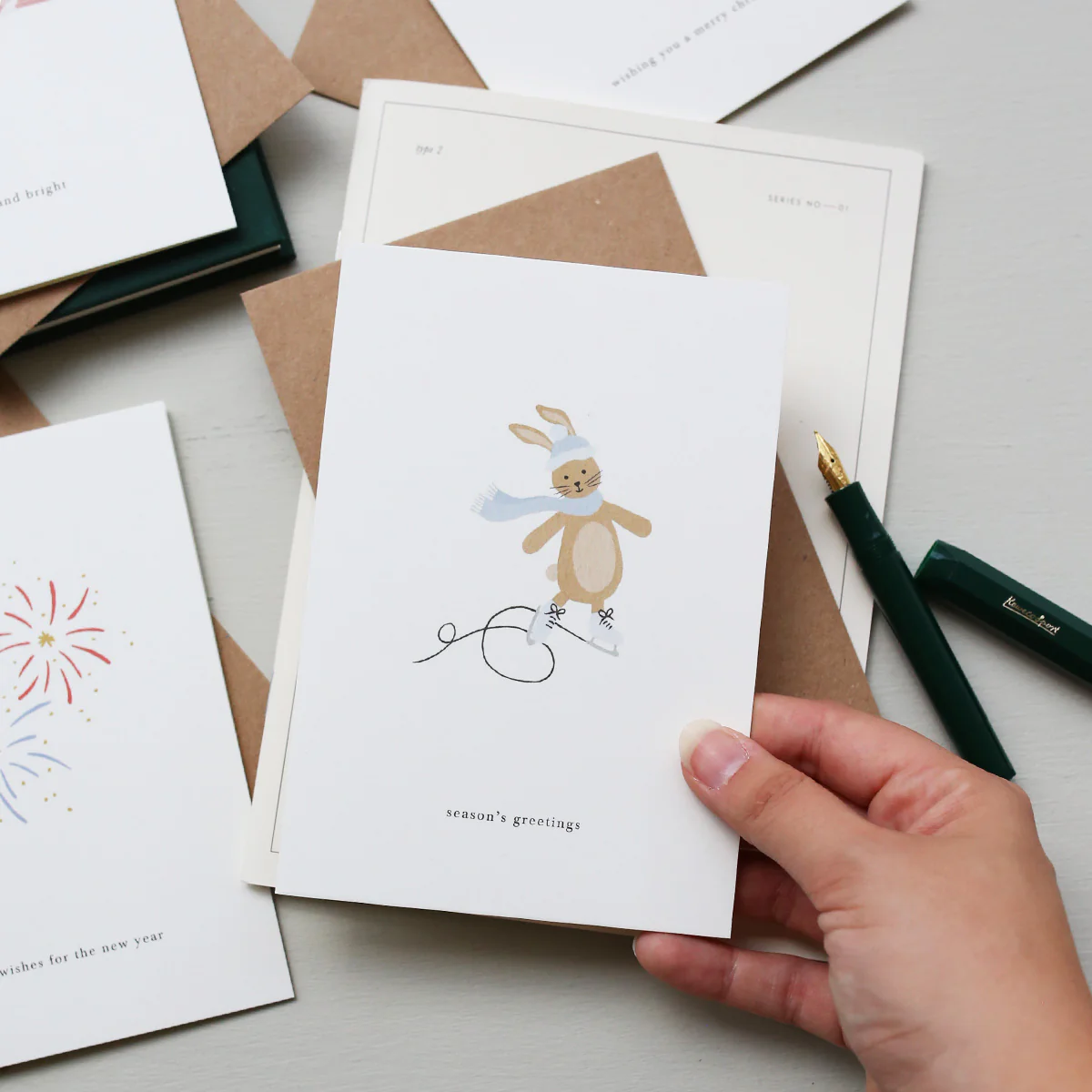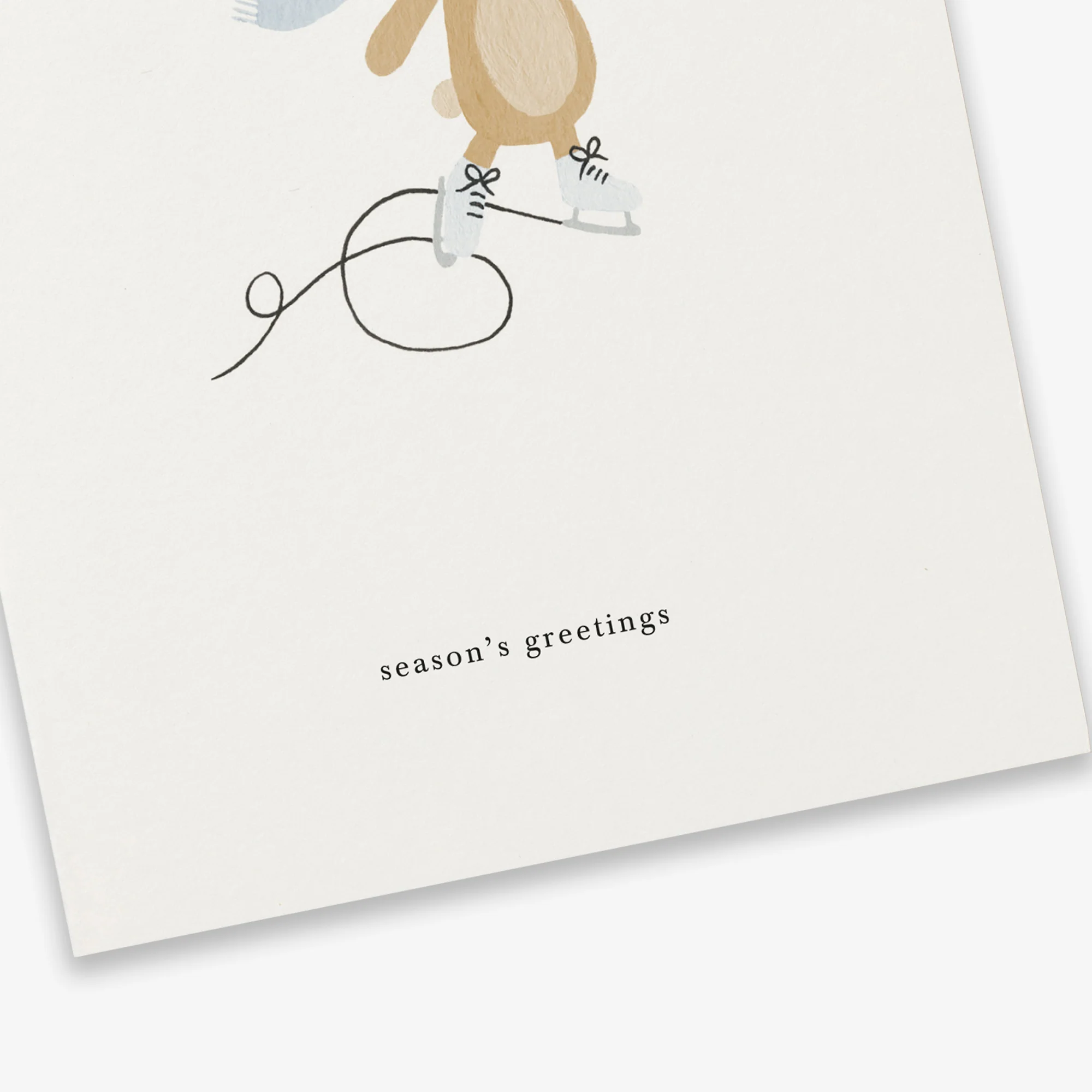 Een lieve winterkaart van Kartotek met een schaatsend konijntje en de tekst “season’s greetings”. Perfect om warme wensen te sturen tijdens de feestdagen of de winterperiode.